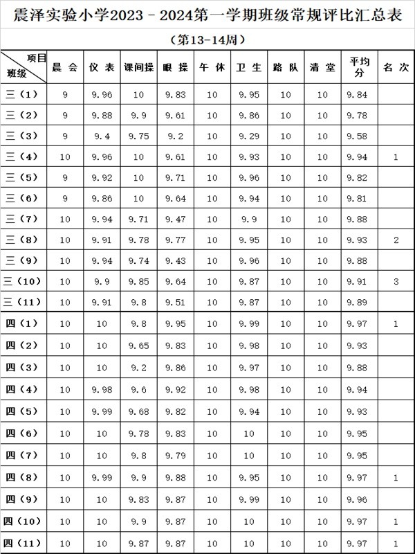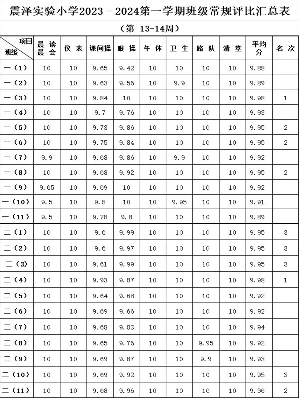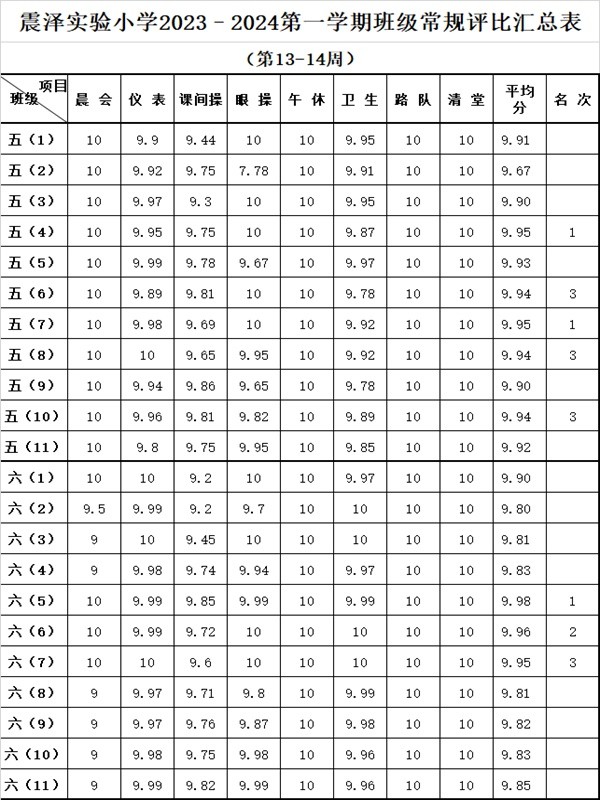 震泽实验小学2023–2024第一学期班级常规评比汇总表(13-14周)