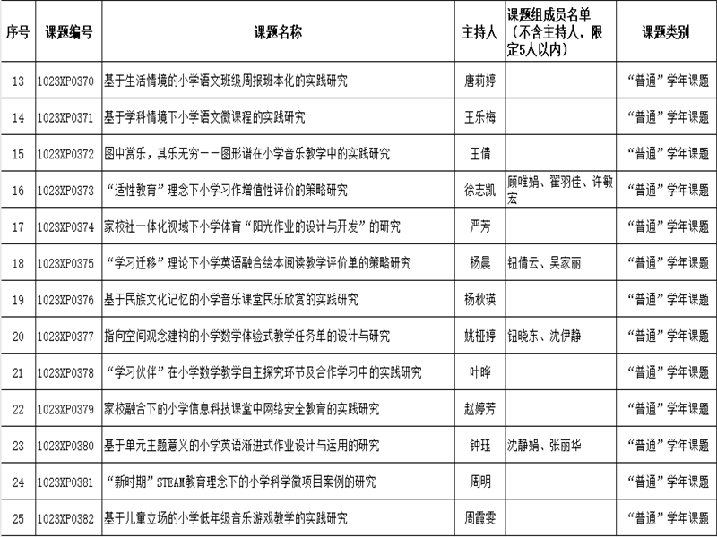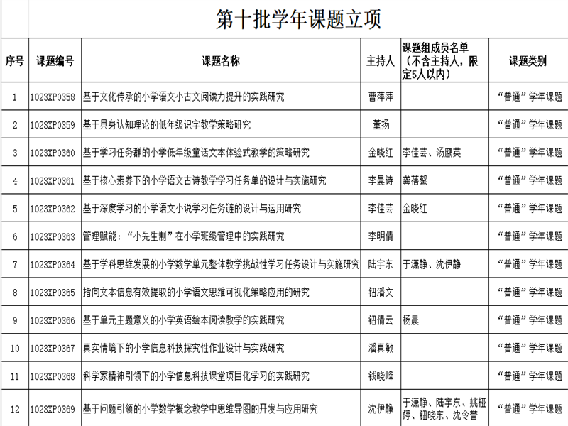 根据“吴教科函〔2023〕8号”文件《关于组织吴江区第十批学年课题申报工作的函》的要求,我区第十批学年课题经各校(园)推荐、申报,区教科室组织专家评委,按照选题、核心概念界定、研究价值、研究内容与重点、研究方法、预期研究成果等6项量化指标,分组进行了匿名盲评,我校申报的第十批学年课题共25项已通过评审并立项,请各学年课题主持人积极制定课题实施方案、拟定课题研究规划、扎实研究,提升研究品味,注重研究过程的积累和成果发布,体现研究价值,按期(2023年1月—2024年8月)完成研究,如期结题。现将课题立项名录公示如下: