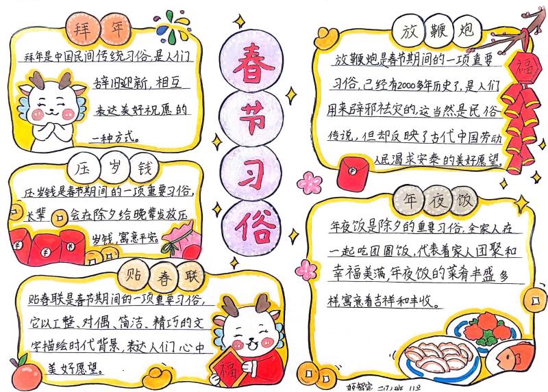 二年级的小蚕宝们收集了很多关于除夕的的习俗,他们用一张张漂亮的手抄报将这些有趣的习俗分享给大家。(手抄报照片)