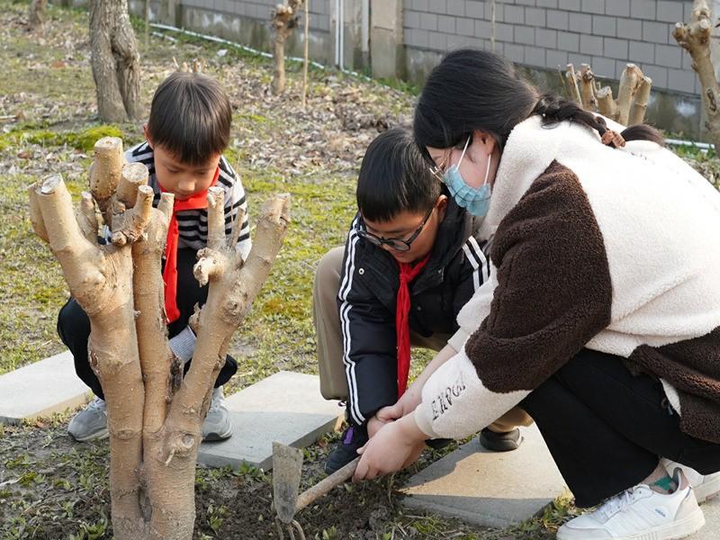 党员教师、团员教师带领少先队员一起给桑树松土、浇水,“鸟鸣桑叶间,绿条复柔柔”,嫩绿的桑叶鼓励着队员们用实际行动纪念这个有意义的日子。