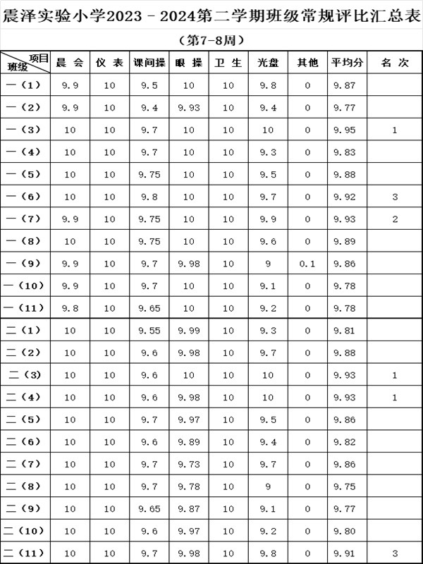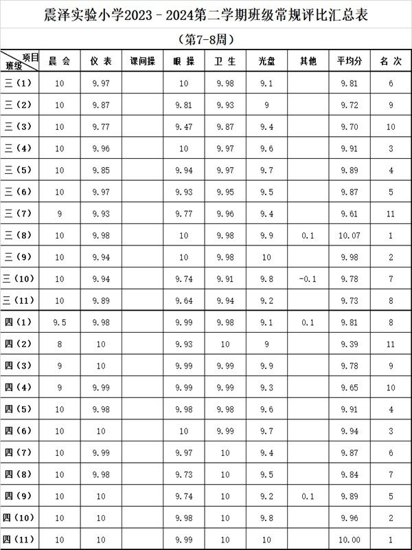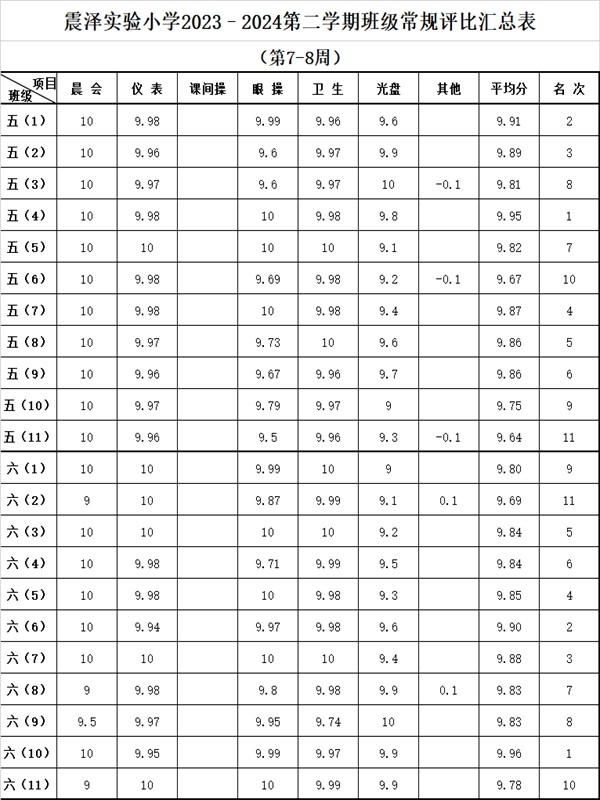 震泽实验小学2023-2024学年第二学期班级常规评比汇总表(7-8周)