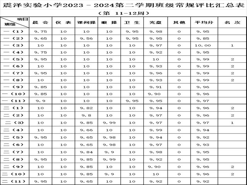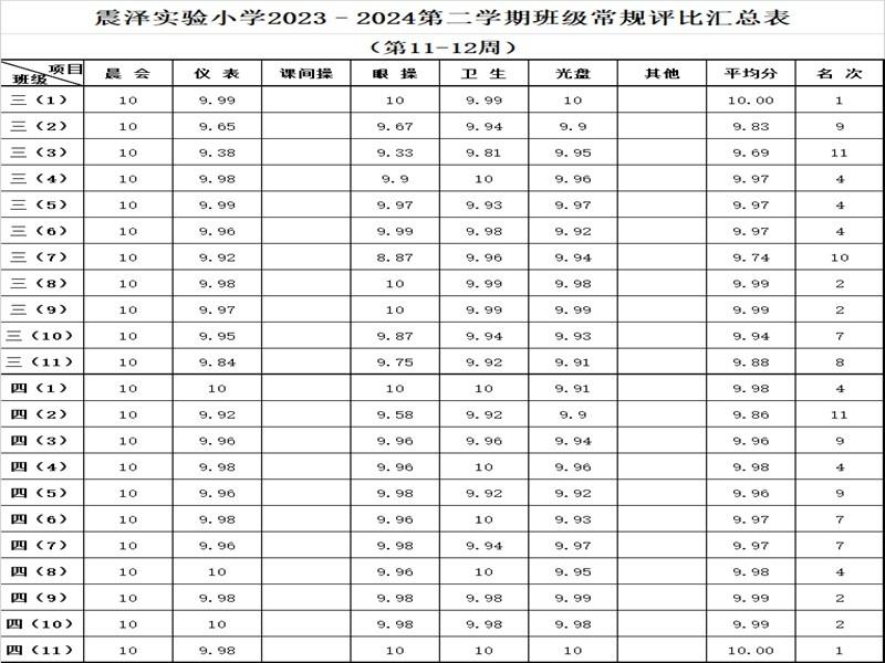 震泽实验小学2023-2024学年第二学期班级常规评比汇总表(11-12周)