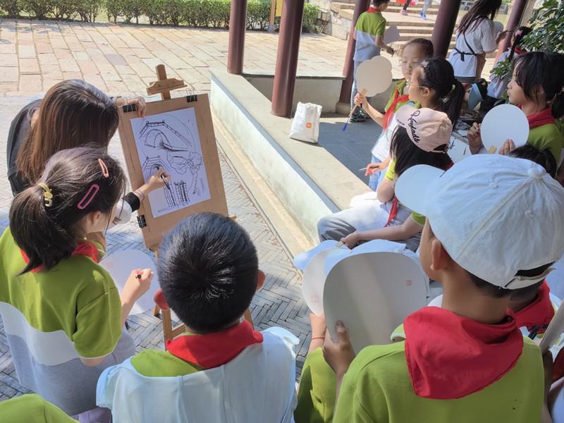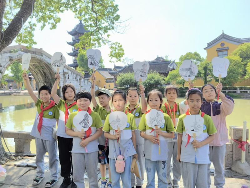 历史悠久的慈云寺塔与禹迹桥相互呼应,构成绝美景观。小蚕宝们在古朴的建筑和静谧的环境中,纷纷捕捉喜欢的景点,静心坐下有模有样地手绘画扇。扇面上的线条流畅而精准,一笔一画都透露出他们对传统文化的敬畏和对艺术的热爱。古镇游览写生,使小蚕宝们感受到了传统与现代的交融,对中国传统文化有了更深刻的理解和感悟。