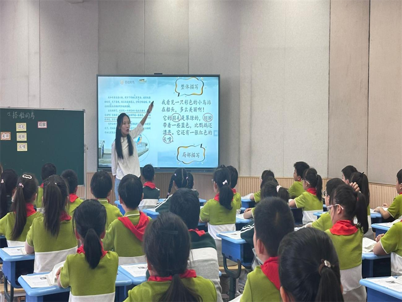 下午第一节课,龚蓓馨老师执教《搭船的鸟》,龚老师紧抓鸟的外形和动作两个方面,带领学生开展课堂活动。在“外形”这一部分,龚老师引导学生抓住中心词“五颜六色”,展开充分练说,同时辅之以图片,为学生搭建语言支架,让学生看着图片进行语言表达活动,充分训练学生的语言表达能力。在“动作”这一部分,龚老师着力让学生揣摩动词,通过换动词,交换动词顺序的方式,让学生发现动词的灵动,这样的教学无疑贴近了语文,将语文全方位渗透进孩子内心,最后辅之以练笔,让学生将课文语言内化为自己的语言。