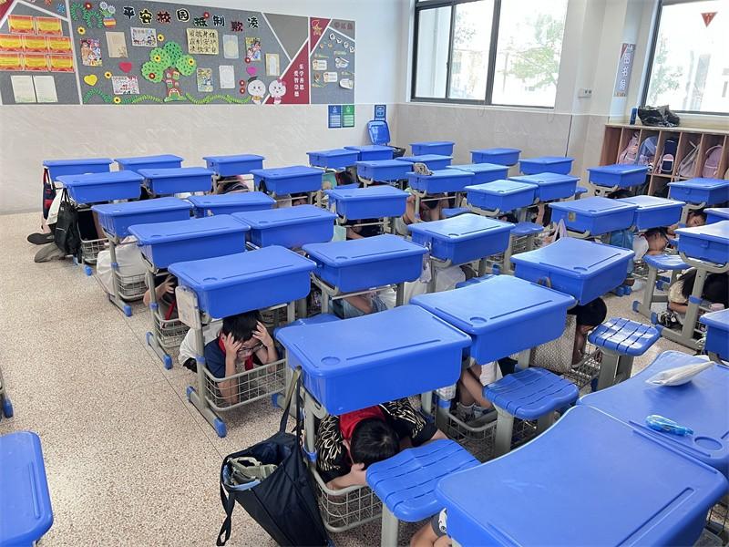 上午8时20分,随着总指挥杨志华校长的一声令下,演练正式拉开帷幕。首先进行的是紧急避险科目。广播中传来急促的警报声,持续30秒,模拟地震突发的紧急情况。各班师生迅速响应,按照预案要求,迅速关闭火源、电源等潜在危险源,并就近蹲在课桌、讲台旁,用手或其他柔软物品保护好头部,尽量蜷曲身体以降低重心。整个避险过程紧张有序,师生们表现出色,均在规定时间内完成了避险动作。紧接着,广播再次响起,宣布进入安全疏散阶段。随着长达2分钟的警报声响起,全校师生按照预定的防灾减灾疏散路线迅速撤离教学楼,前往操场集合。各楼层、楼梯口的安全岗老师提前到位,指挥学生有序撤离。学生们在班主任和任课教师的带领下,采取快走方式,按照班级顺序迅速撤离至操场指定区域。整个疏散过程有条不紊,未发生任何拥挤和摔倒现象。