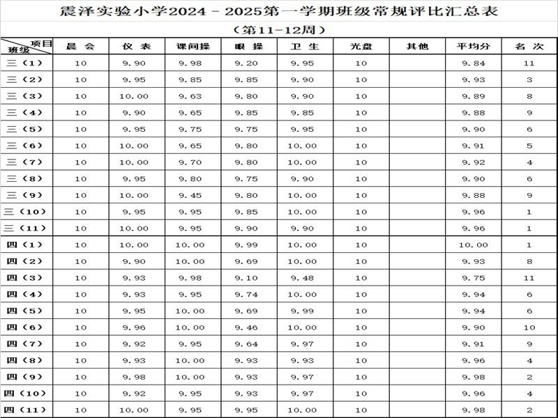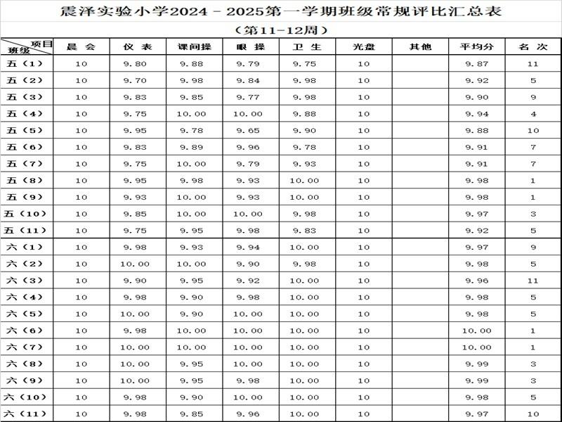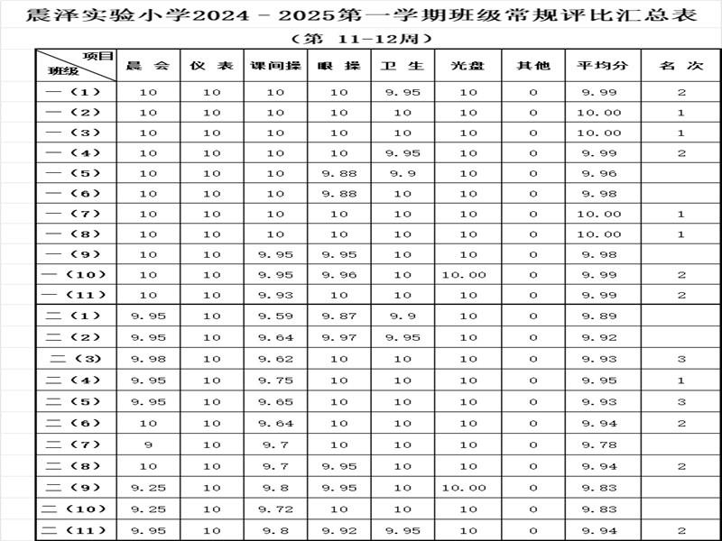 震泽实验小学2024–2025第一学期班级常规评比汇总表(11-12周)