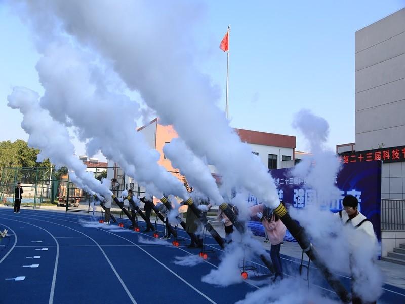 开幕式上杨志华校长发表了热情洋溢的致辞,他强调了科技教育的重要性,鼓励同学们积极参与科技活动,培养自己的创新能力和实践能力。八门“液氮大炮”齐发拉开了科技节的序幕。