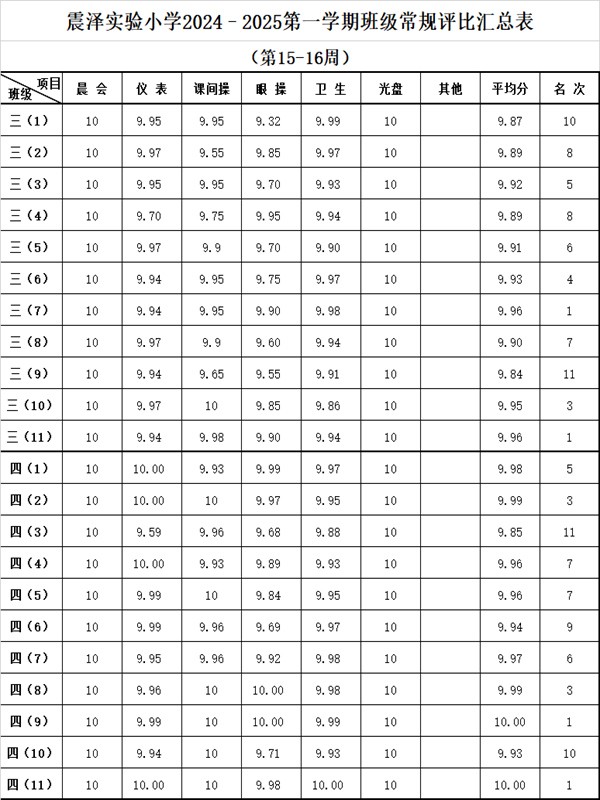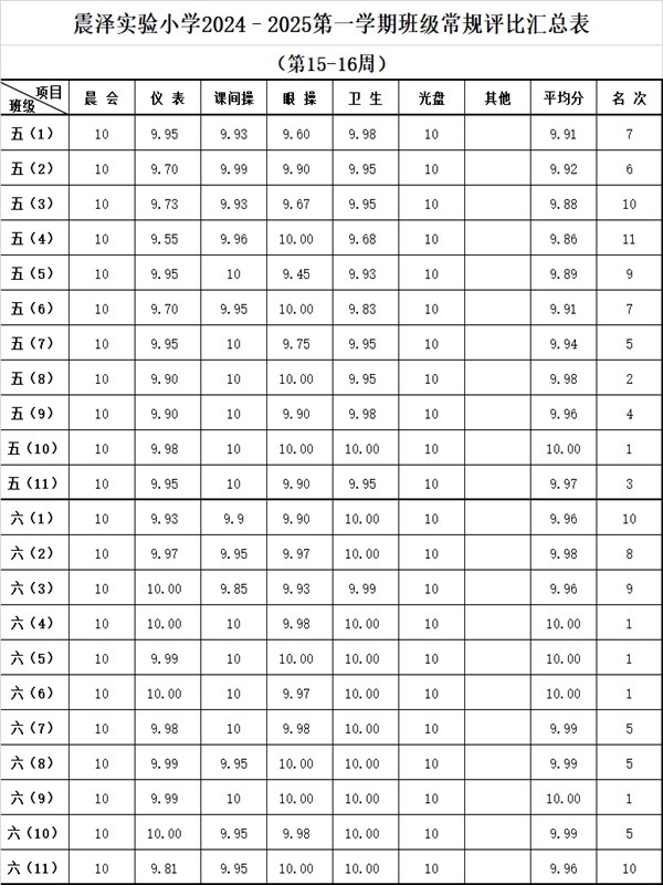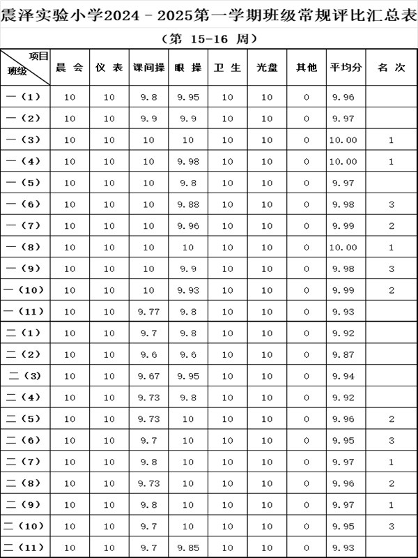 震泽实验小学2024–2025第一学期班级常规评比汇总表(15-16周)
