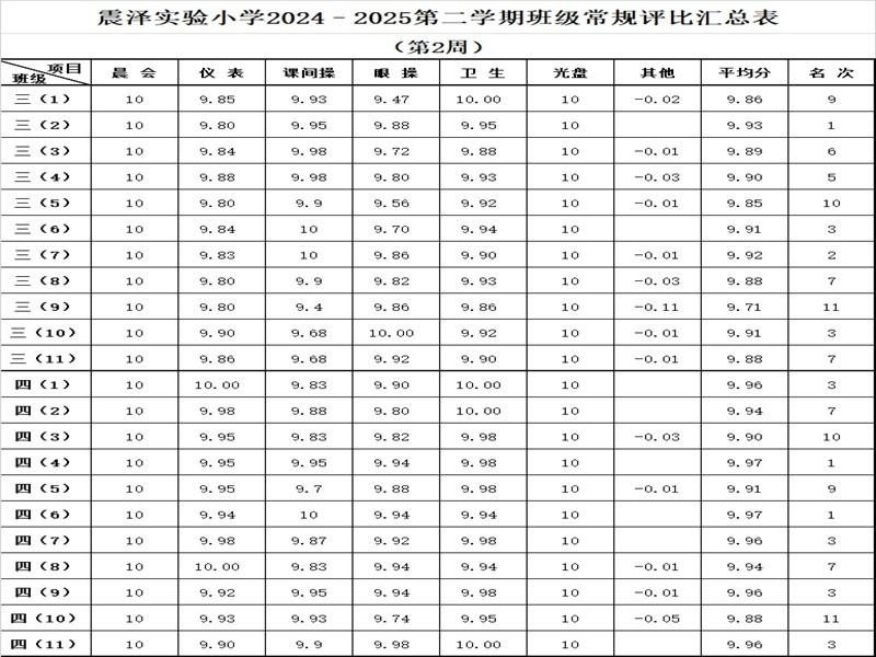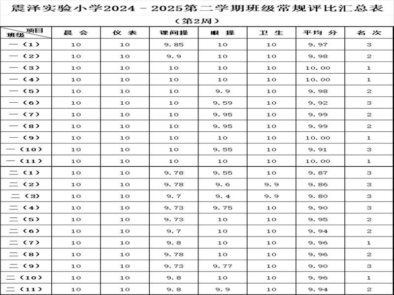震泽实验小学2024–2025第二学期班级常规评比汇总表(第2周)