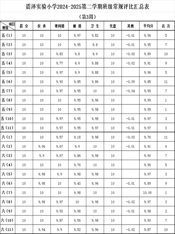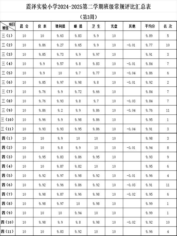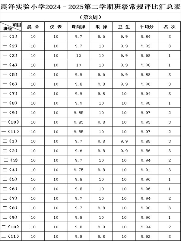 震泽实验小学2024–2025第二学期班级常规评比汇总表(第3周)