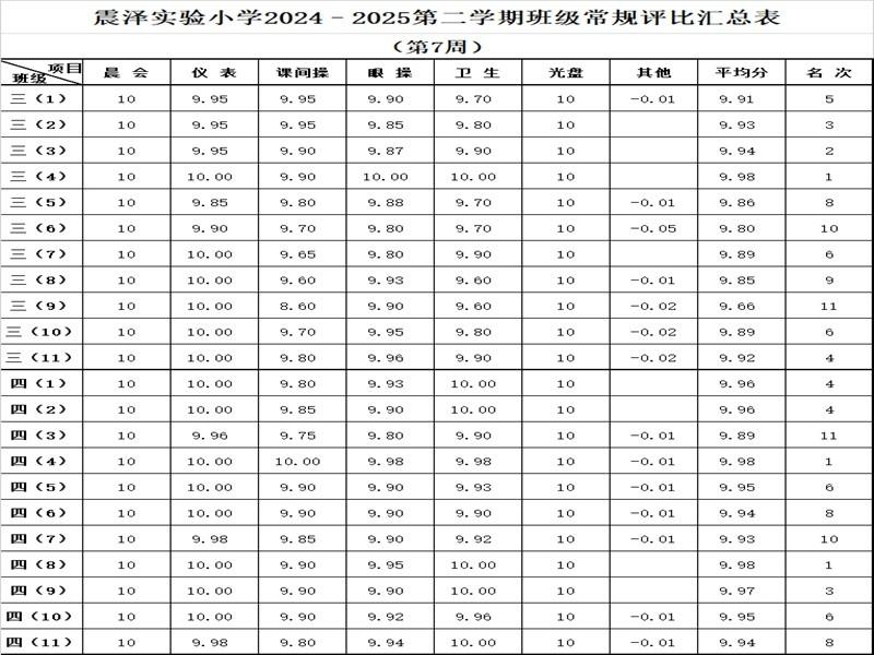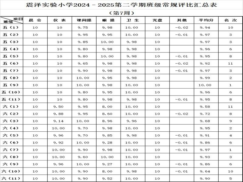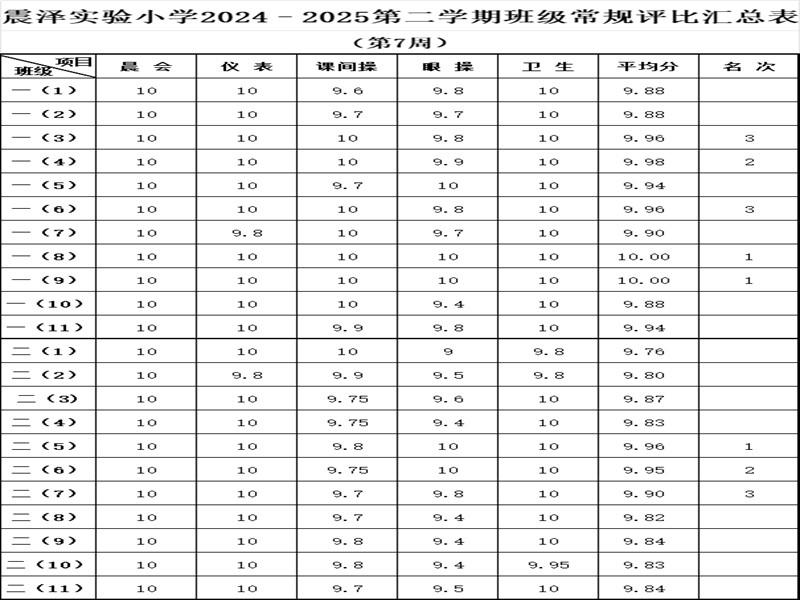 震泽实验小学2024–2025第二学期班级常规评比汇总表(第7周)