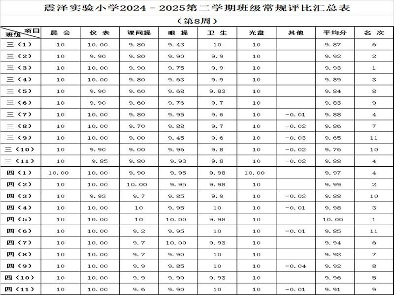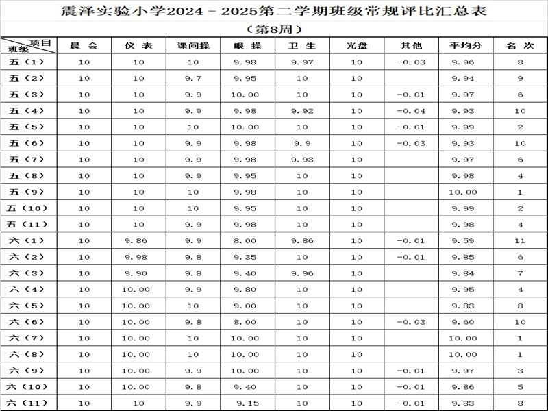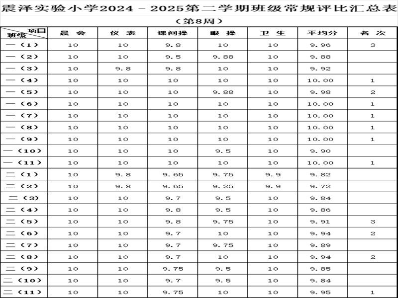 震泽实验小学2024–2025第二学期班级常规评比汇总表(第8周)