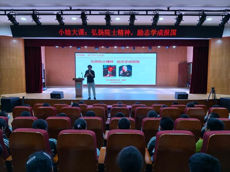 习爷爷在两院院士大会讲话“要以与时俱进的精神、革故鼎新的勇气、坚忍不拔的定力,面向世界科技前沿、面向经济主战场、面向国家重大需求、面向人民生命健康,把握大势、抢占先机,直面问题、迎难而上,肩负起时代赋予的重任,努力实现高水平科技自立自强!”为厚植家国情怀,激发青少年科学探索热情,4月21日,吴江区教育局关工委讲师团冯建华老师走进震泽实验小学,为五年级全体学生带来一场以“弘扬院士精神,励志学成报国”为主题的精彩讲座。冯老师聚焦吴江籍院士的奋斗故事,特别是震泽杰出乡贤杨嘉墀院士、施敏院士的传奇人生,给震小的同学们留下了深刻的印象。