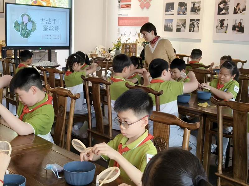 活动的重头戏是制作古法手工蚕丝扇。胡老师展示了国家级非遗项目“吴江蚕丝被制作技艺”的衍生技法:“我们采用‘经纬交织’的传统工艺,先将蚕丝横向缠绕扇骨,再纵向加固,最后点缀珍珠和流苏。”孩子们按照步骤,将抽好的蚕丝均匀缠绕在扇骨上,当薄如蝉翼的蚕丝覆盖扇面时,一把把充满童趣的蚕丝扇初具雏形。