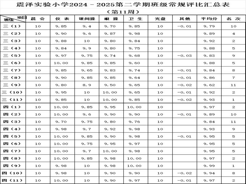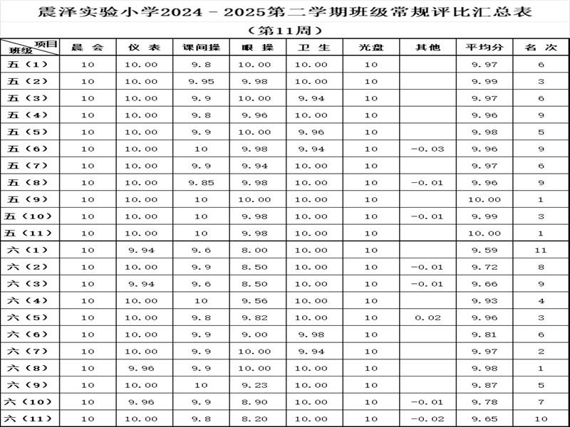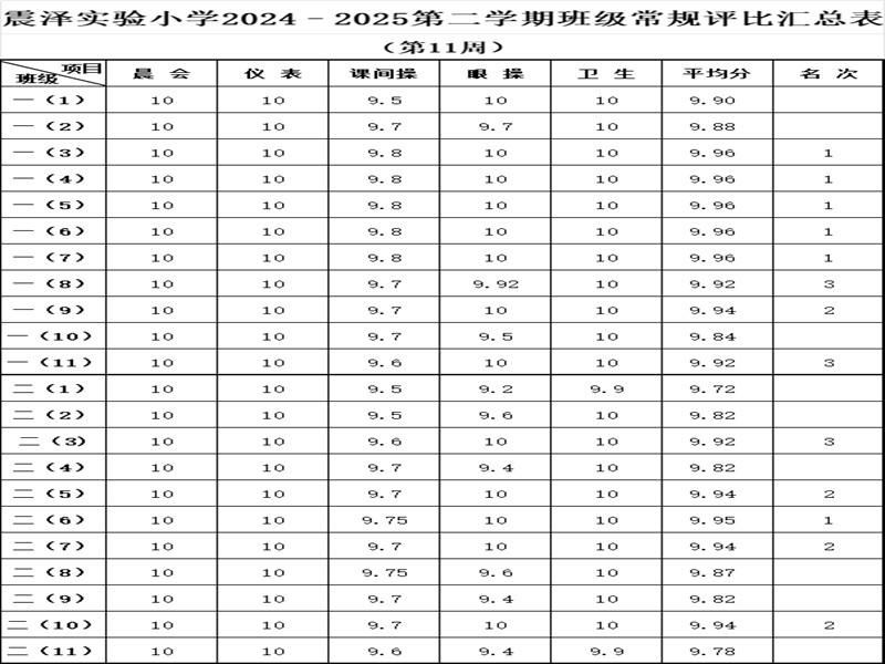 震泽实验小学2024–2025第二学期班级常规评比汇总表(第11周)