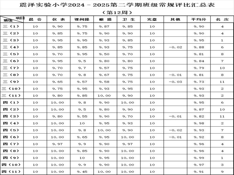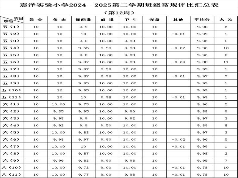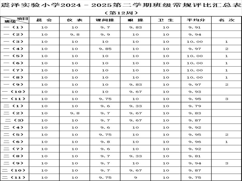 震泽实验小学2024–2025第二学期班级常规评比汇总表(第12周)