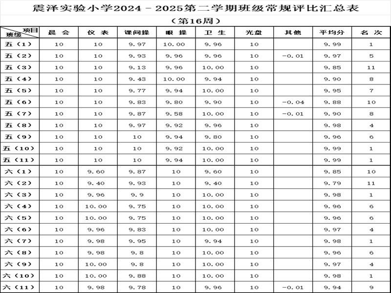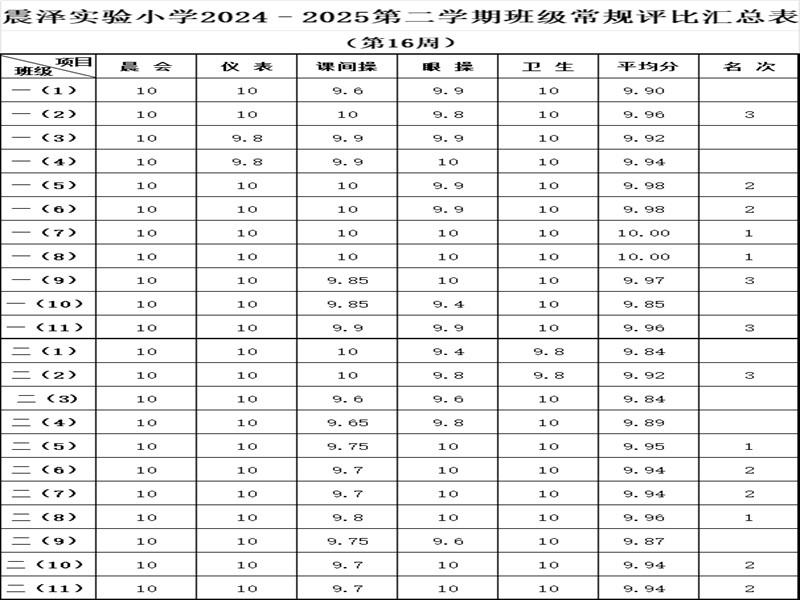 震泽实验小学2024–2025第二学期班级常规评比汇总表(第16周)