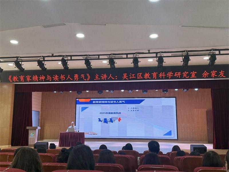 时序更迭,新学期的帷幕徐徐拉开。2025年8月28日上午,吴江区教育科学研究室原主任余家友莅临我校,作题为《教育家精神与读书人勇气》的专题讲座。活动由震泽实验小学教科室主任杨秋瑛主持,全体教师参与。