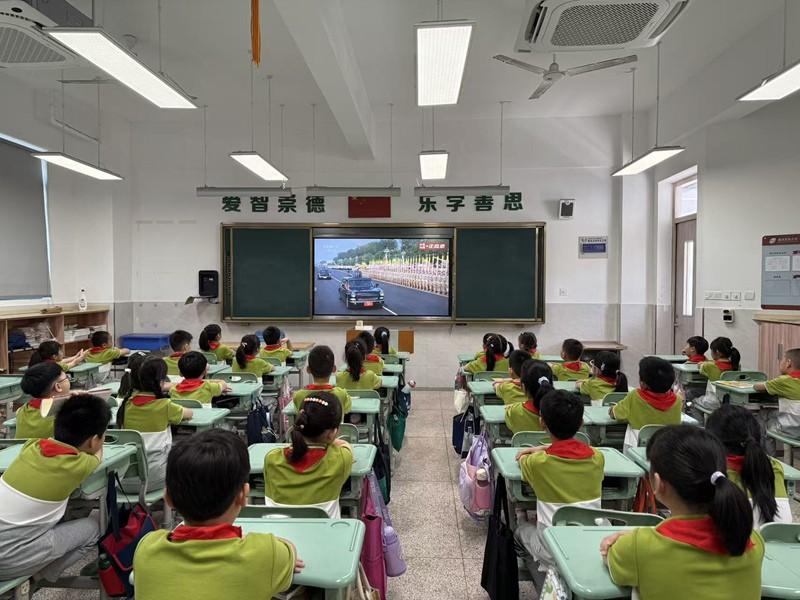 为让学生直观感受国家国防实力,“五老”代表们坐在学生身边,共同观看阅兵视频。观看过程中,不时为同学们轻声解读:“你看这整齐的队伍,体现的是军人的纪律性;这新型坦克,是我们国家自己研发的,说明我们的国防科技越来越强了!” “五老”们的实时解读,让“壮观场面”转化为“国防认知”,让学生们对“国家强大”有了更深刻的理解。