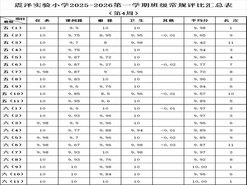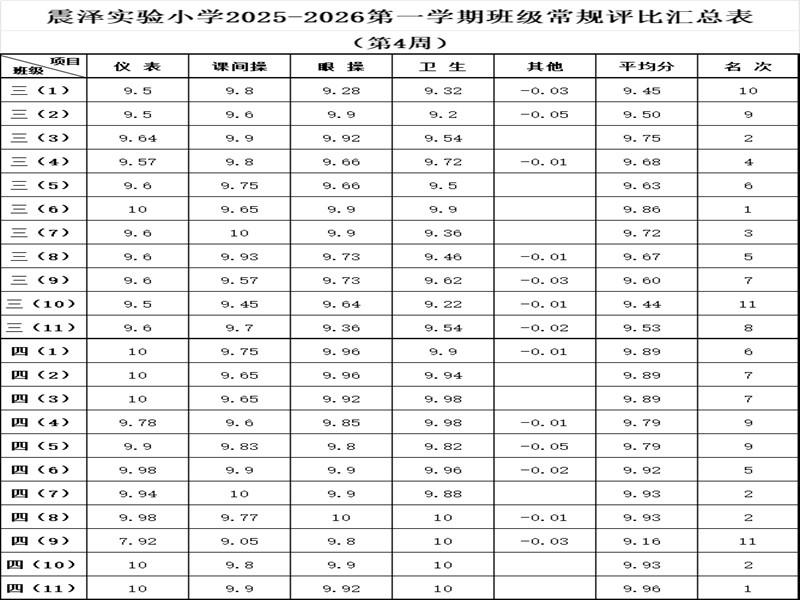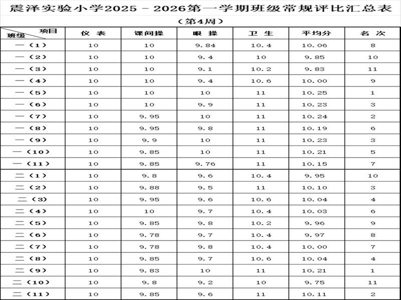 震泽实验小学2025–2026第一学期班级常规评比汇总表(第4周)