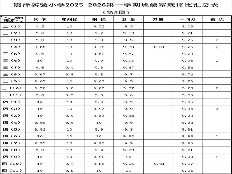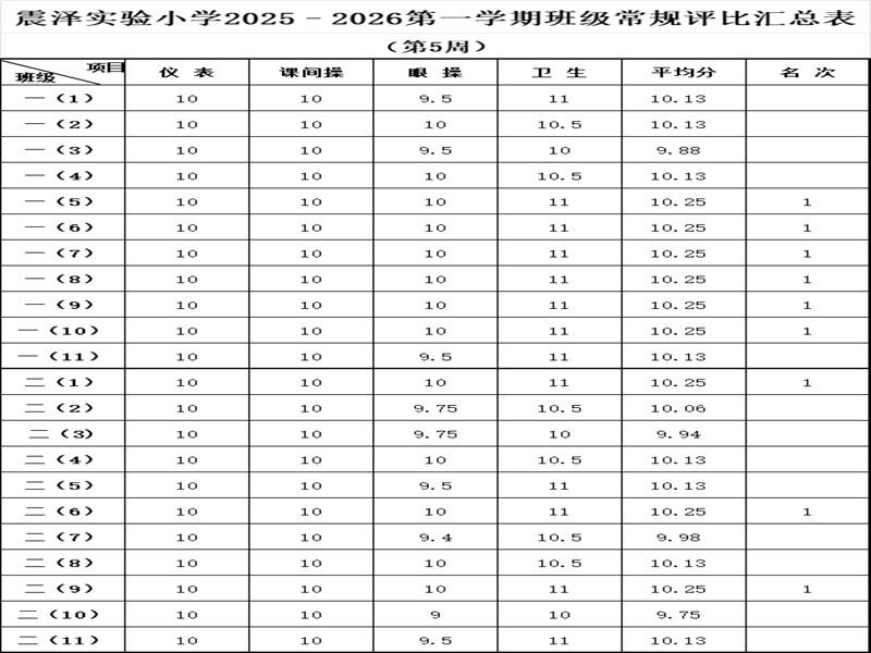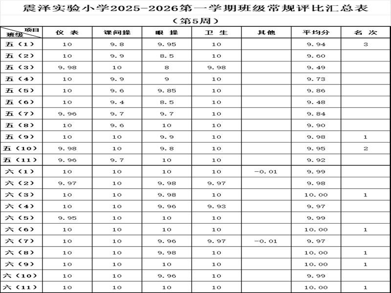 震泽实验小学2025–2026第一学期班级常规评比汇总表(第5周)