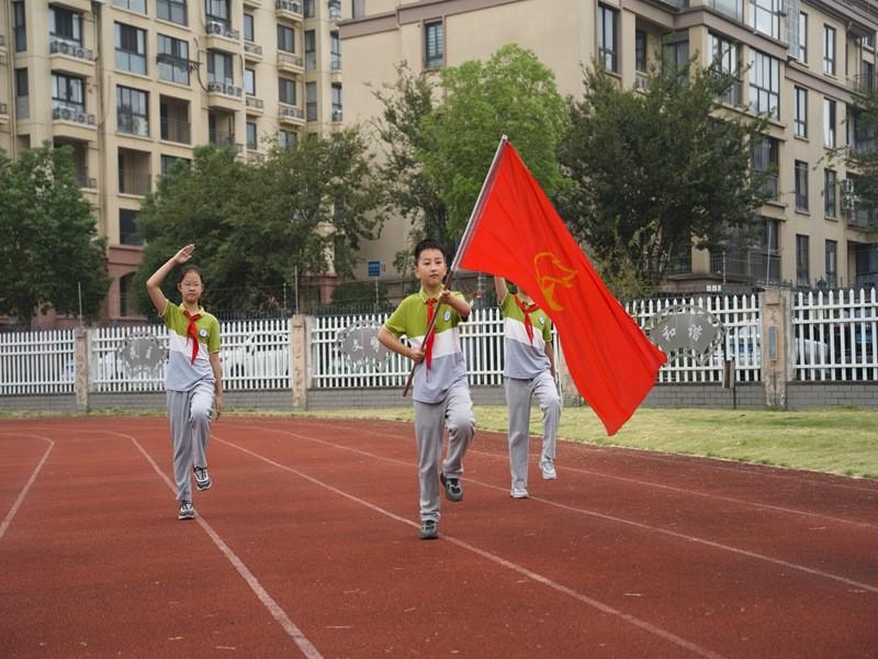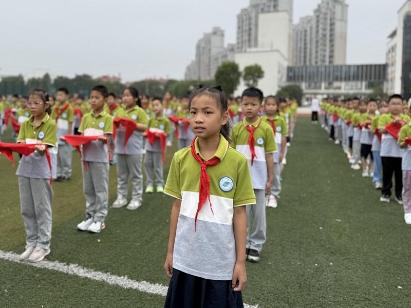 随着 “出旗!” 指令的下达,激昂的出旗曲响彻校园,旗手们昂首挺胸,手擎鲜艳的少先队队旗稳步前行。随后,《中国少年先锋队队歌》的高昂旋律响起,新老队员齐声合唱,稚嫩的嗓音中充满坚定,唱出了对少先队组织的热爱和成为共产主义事业接班人的远大志向。