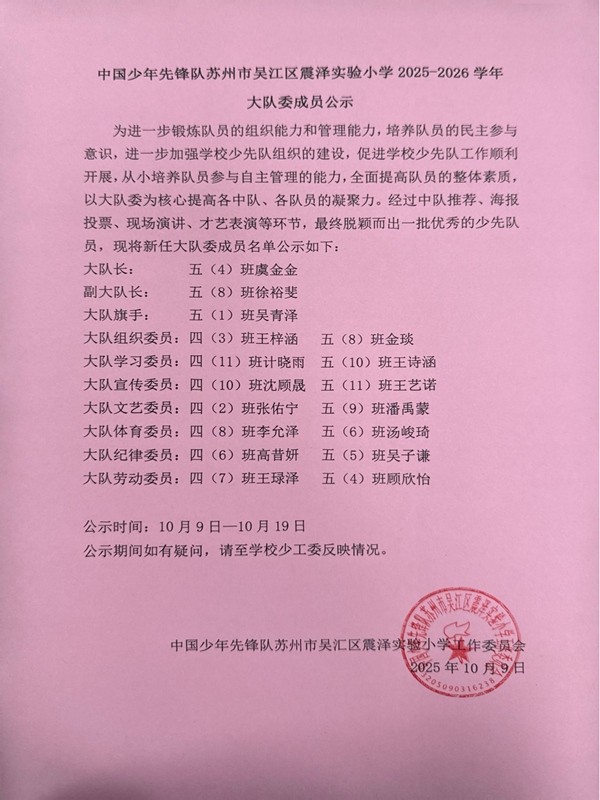 为深入响应 “强国复兴有我” 时代号召,加强少先队小干部队伍建设,引导少先队员树立使命意识、培养担当精神,近日,震泽实验小学以 “强国复兴有我 争做新时代好少年” 为核心主题,启动2025年少先队大队委竞选活动。活动面向四、五年级全体少先队员公开择优选拔,以 “自己的活动自己干、自己的阵地自己建、自己的事情自己管” 为主线,鼓励队员在竞选实践中锤炼本领,以小岗位托举大梦想,让红领巾在新时代征程中焕发新光彩。