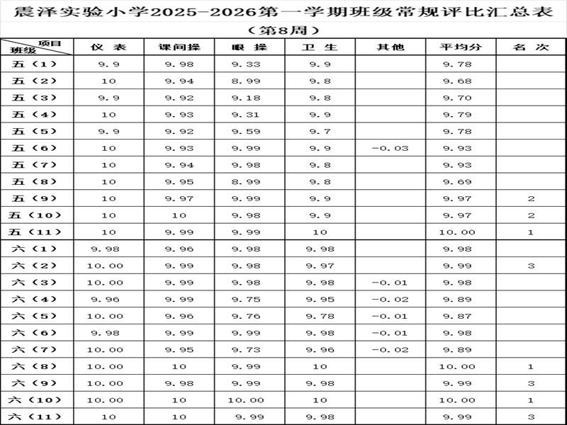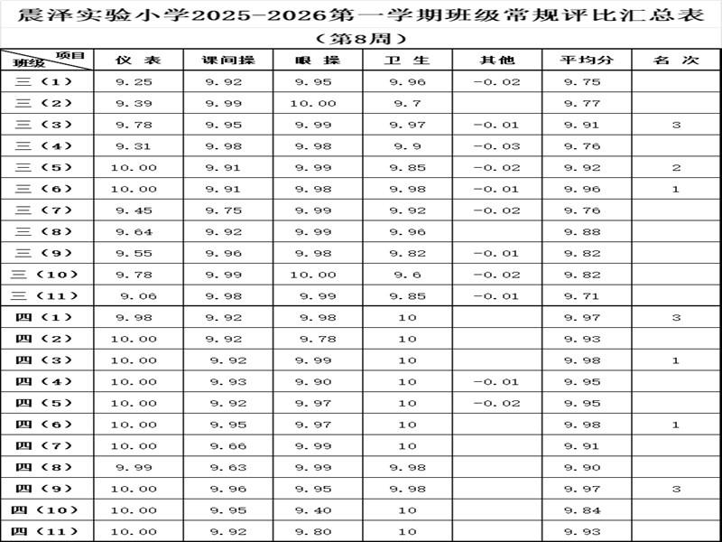 震泽实验小学2025–2026第一学期班级常规评比汇总表(第8周)