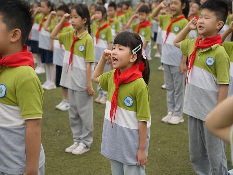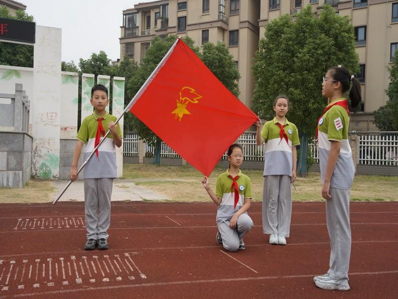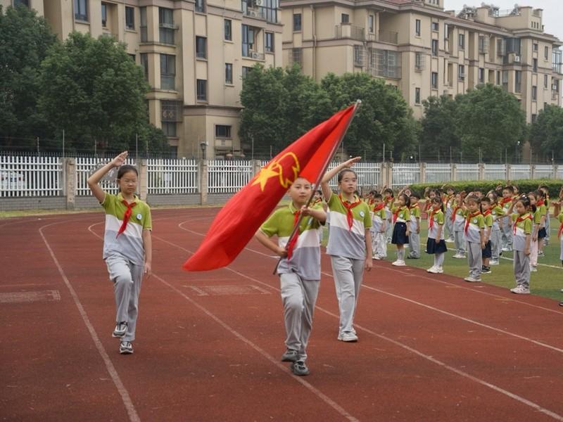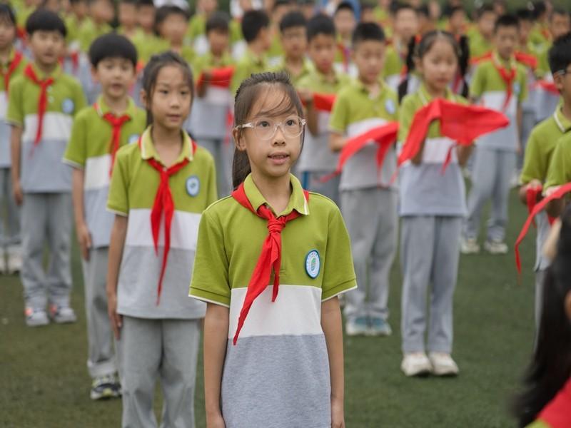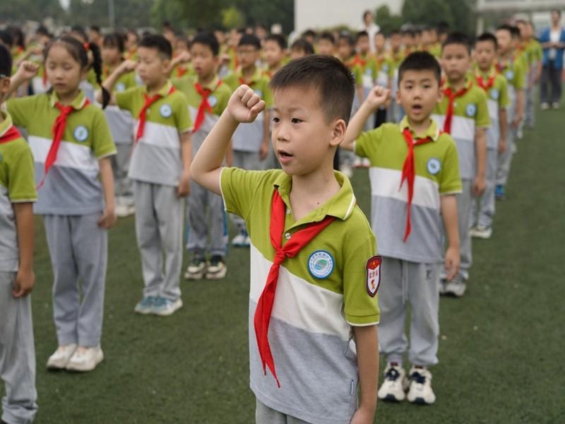 “出旗!”随着指令下达,激昂的出旗曲响彻校园,旗手们昂首挺胸,手擎鲜艳的少先队队旗稳步前行,红色旗帜在阳光下熠熠生辉,全场队员肃立致敬。紧接着,《中国少年先锋队队歌》的高昂旋律响起,新老队员齐声合唱,稚嫩的嗓音里满是坚定,唱出了对少先队组织的热爱,更唱出了成为共产主义事业接班人的远大志向。