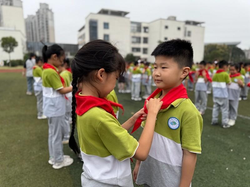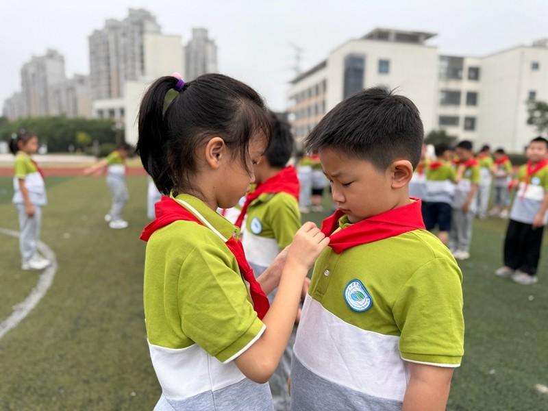 在庄严的氛围中,大队辅导员郑重宣读新队员名单。当听到自己的名字时,新队员们精神抖擞,脸上洋溢着自豪与喜悦——从这一刻起,他们拥有了共同的光荣称号:中国少年先锋队队员。老队员们迈着整齐的步伐上前,郑重地为新队员系上红领巾,手把手教他们规范系法;新队员轻轻抚摸着胸前的红领巾,眼神里满是珍视与骄傲,小小的身影挺直了脊梁。