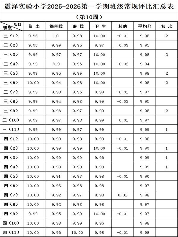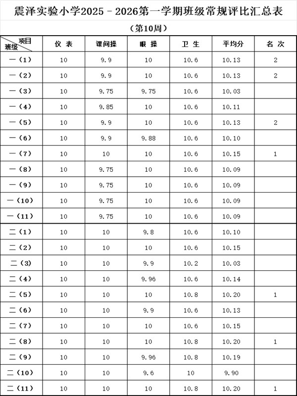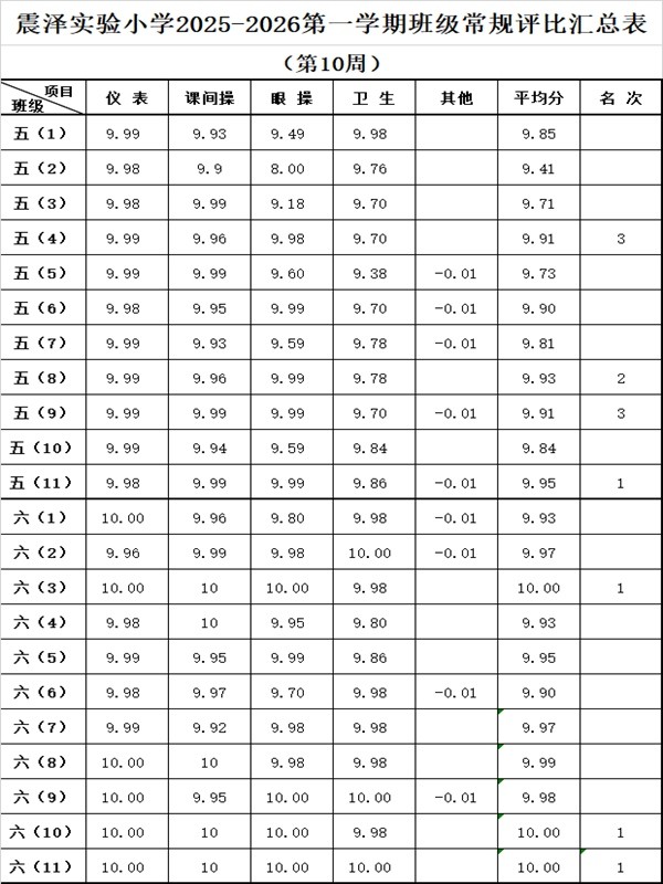 震泽实验小学2025–2026第一学期班级常规评比汇总表(第10周)