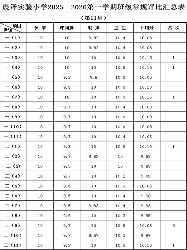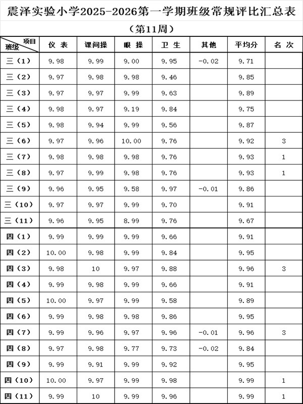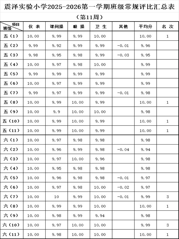 震泽实验小学2025–2026第一学期班级常规评比汇总表(第11周)