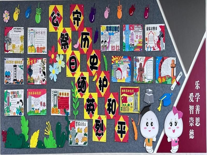 活动前期,学校营造浸润式纪念氛围。升旗仪式上徐老师以《铭记历史 守护和平》发表国旗下讲话,讲述公祭日初衷与南京大屠杀史实;红领巾广播站推出专题播报,分享抗战小英雄故事、诵读《和平宣言》;各班黑板报以文字画笔呈现公祭日知识与和平寄语,传递对逝者的缅怀。