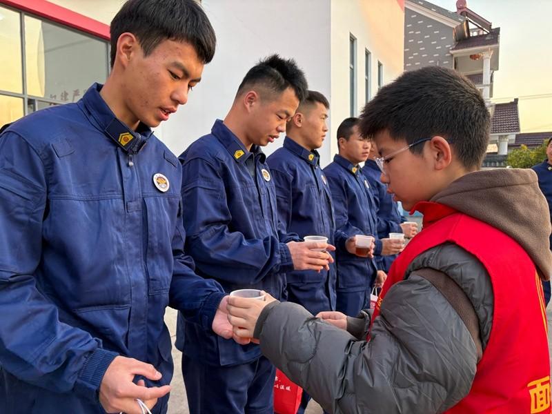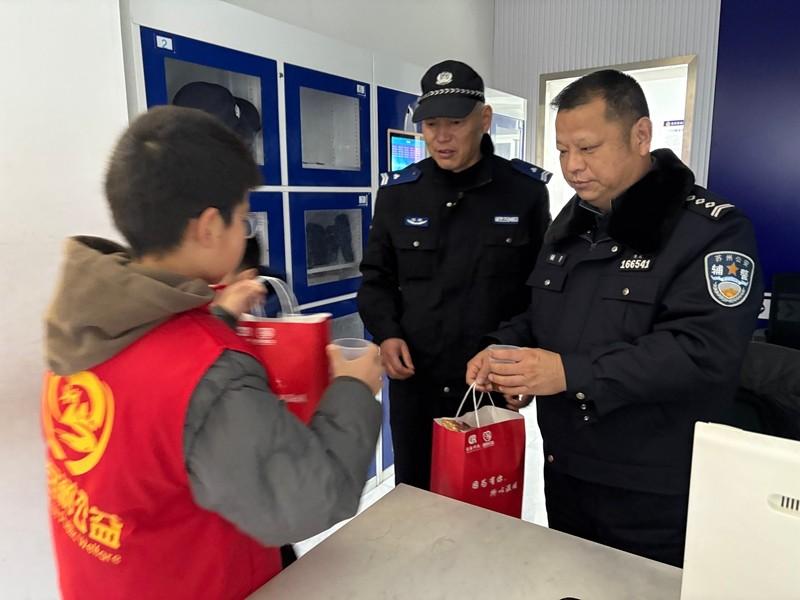 队员们分组走上街头,寒风中红领巾格外耀眼。他们先为清扫街道的环卫工人递上姜茶,真诚道贺新年、问候辛劳。环卫工人接过热茶,暖流直抵心底,欣慰夸赞。随后,队员们又将姜茶送到交警、公交司机、快递小哥手中,每一句问候、每一个举动,都驱散了严寒,定格成新年最美画面。