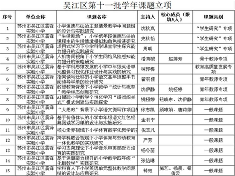 为落实小学科学教育实践创新要求,我申报了吴江区第十一批学年课题,预期 2027 年 8 月完成。本课题明确项目式学习以学生为中心,通过真实复杂任务驱动合作探究,核心聚焦学生提出问题、实验操作、分析论证等探究能力培养。研究将探索适配小学科学课堂的项目式学习策略,设计不同科学主题的教学案例,通过课堂实践验证成效并优化改进,为一线教学提供参考。