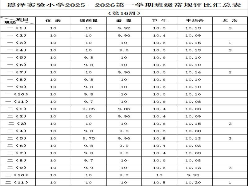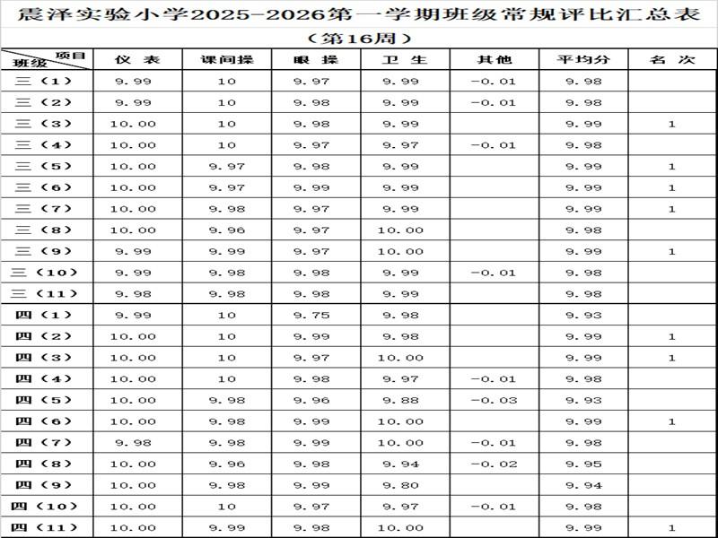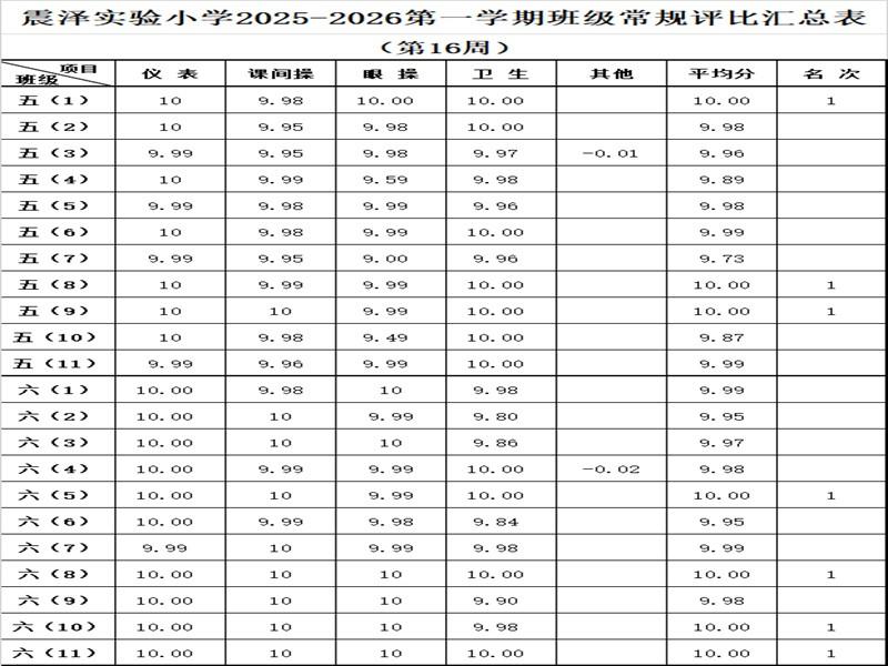 震泽实验小学2025–2026第一学期班级常规评比汇总表(第16周)
