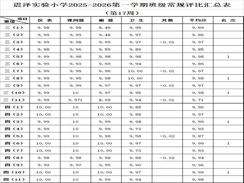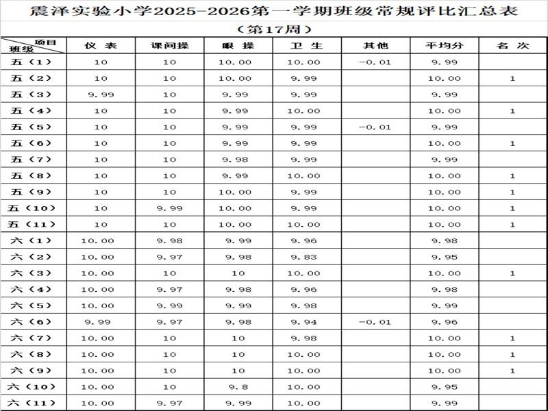 震泽实验小学2025–2026第一学期班级常规评比汇总表(第17周)