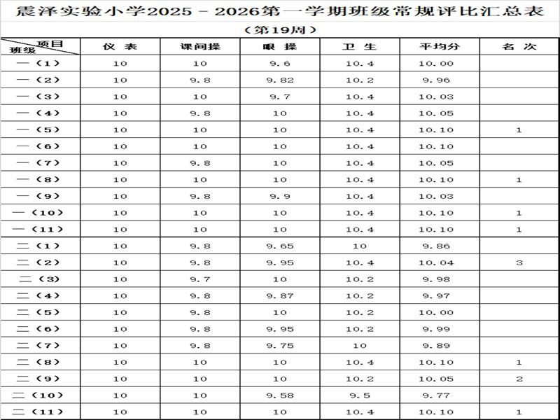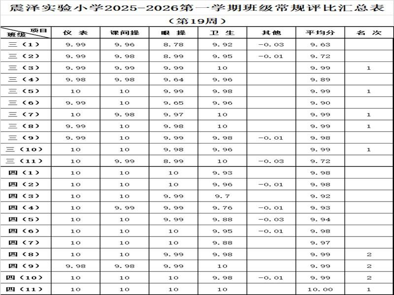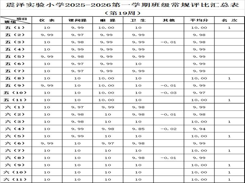 震泽实验小学2025–2026第一学期班级常规评比汇总表(第19周)