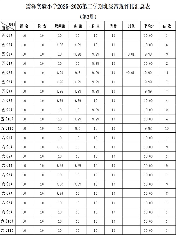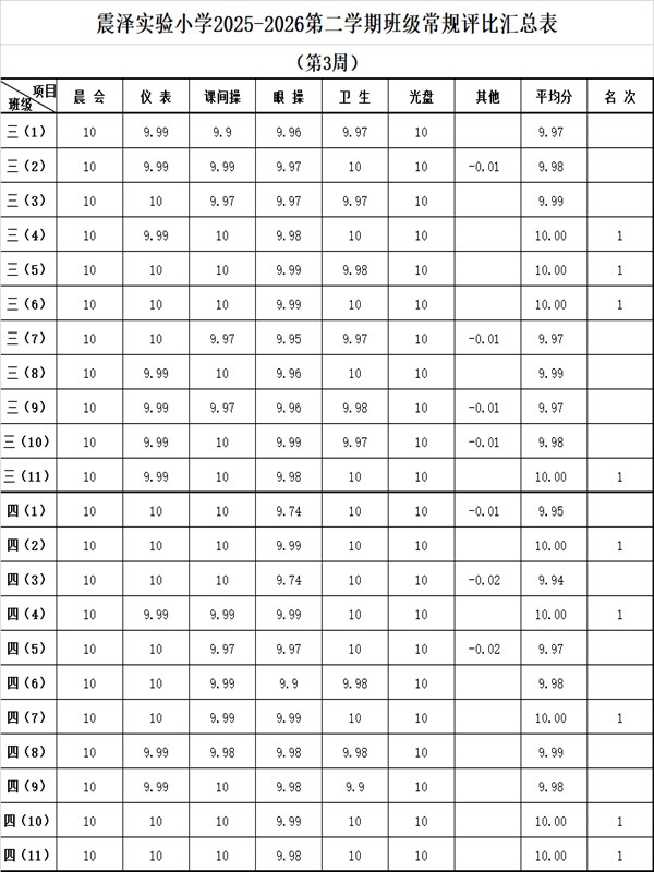 震泽实验小学2025–2026第二学期班级常规评比汇总表(第3周)