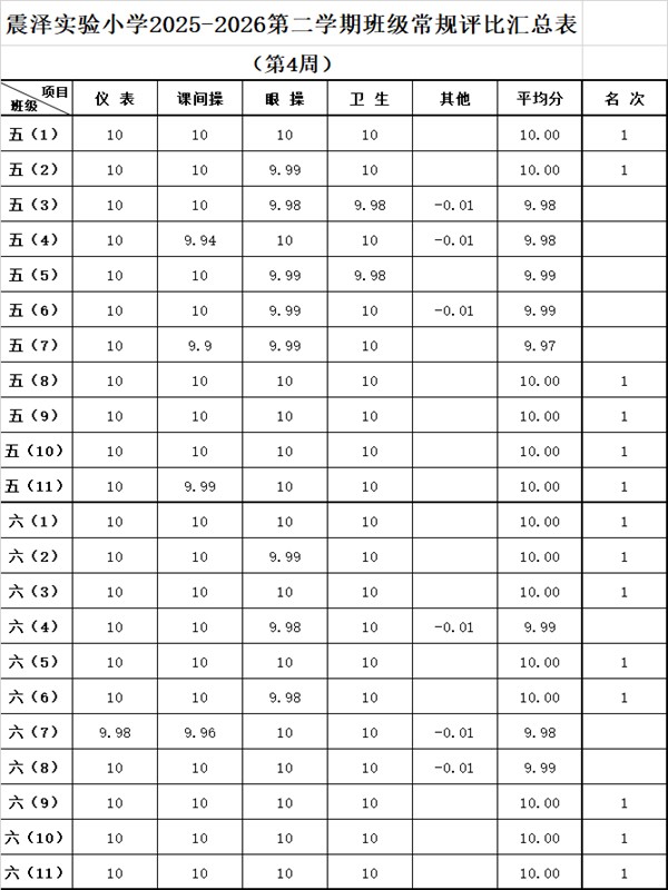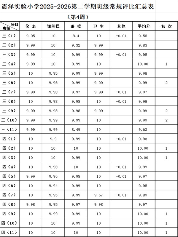 震泽实验小学2025–2026第二学期班级常规评比汇总表(第4周)
