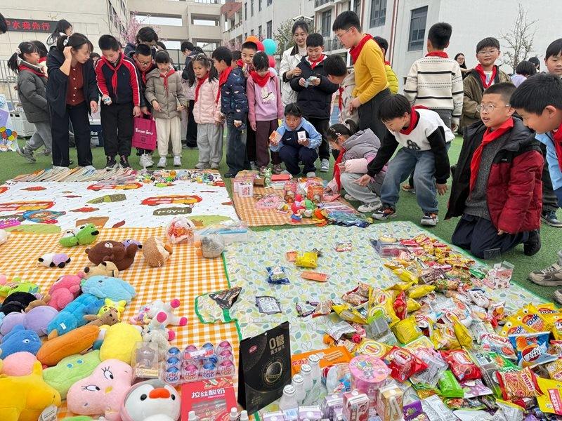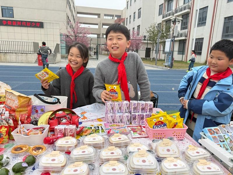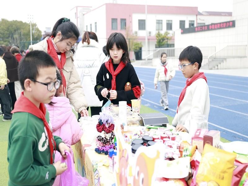 活动现场,各个摊位整齐有序、琳琅满目,小售货员们热情吆喝、礼貌推介,认真接待每一位 “顾客”。老师、家长志愿者也来到现场,陪伴支持、维护秩序。队员们穿梭在各个摊位之间,精心挑选、踊跃购买,用自己的零花钱献出一份爱心。整个校园欢声笑语、暖意融融,处处洋溢着互助与分享的美好氛围。