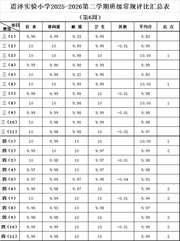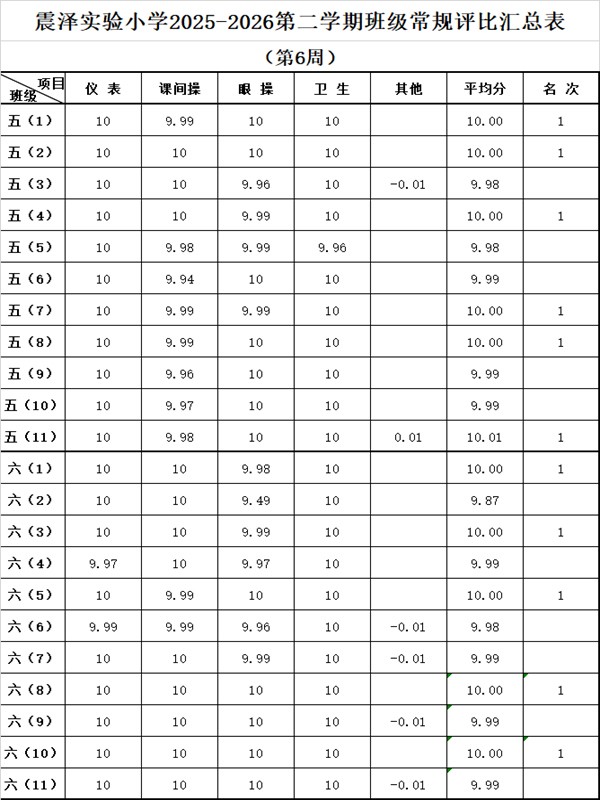 震泽实验小学2025–2026第二学期班级常规评比汇总表(第6周)